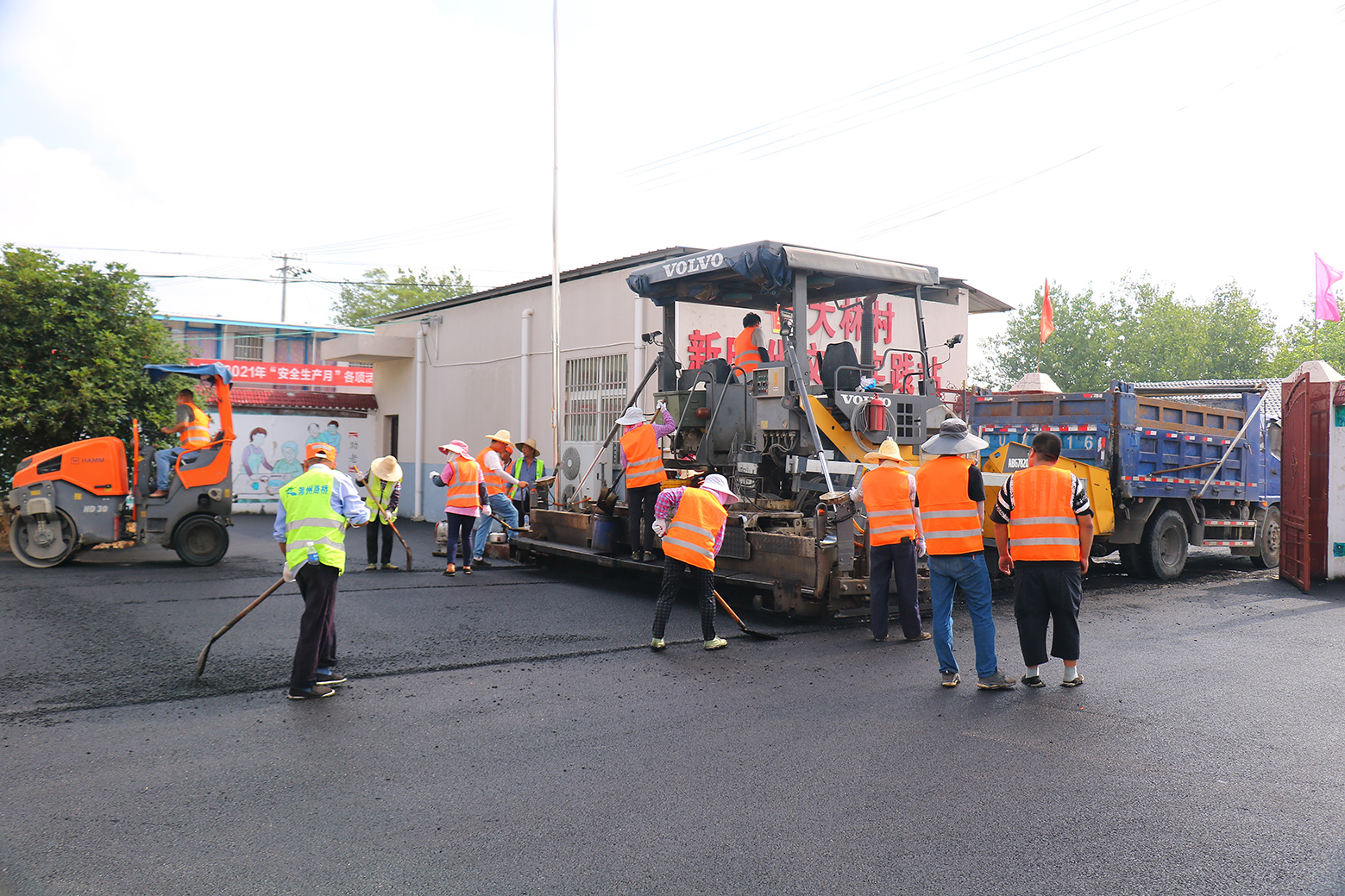 8月5日清晨,我處組織X005項目部施工隊伍展開施工工作。處黨總支委員彭林同志赴施工現(xiàn)場進行調(diào)度指揮,瀝青攤鋪機、各型號壓路機密切配合,如同畫匠手中的彩筆,有條不紊,以點到面,逐步勾畫出嶄新平整的路面。不到一天的時間,面目一新的村委會廣場、暢通無阻的養(yǎng)老院小路呈現(xiàn)在村民面前,為鄉(xiāng)村的美麗增添了一筆濃墨重彩的畫卷。